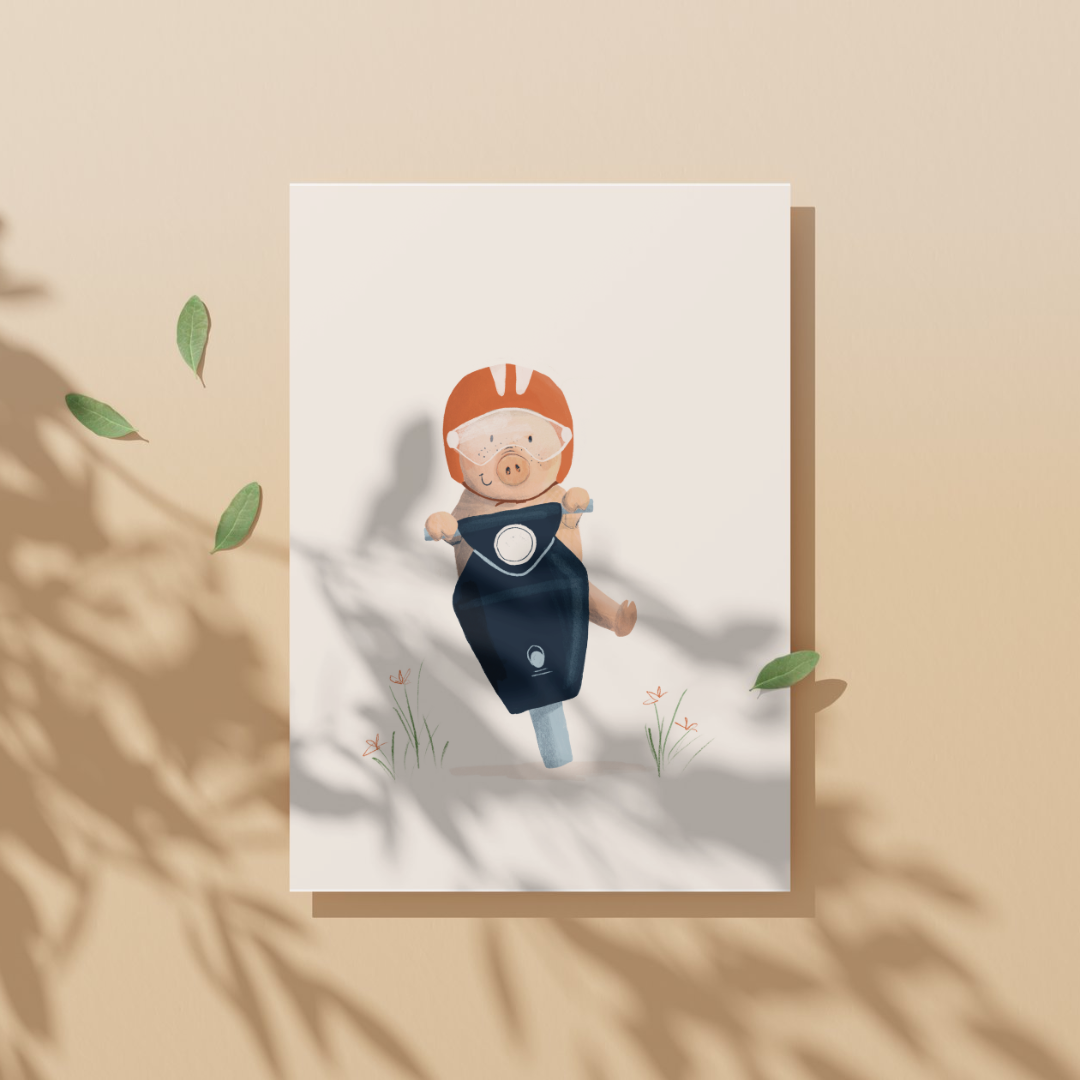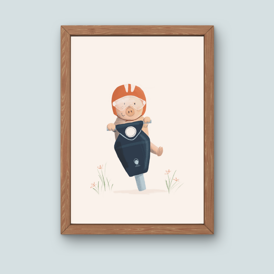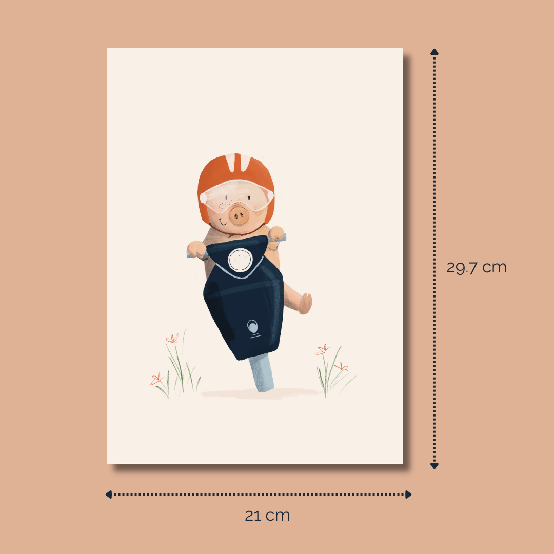 Rijdt dit lieve varkentje straks jouw kamer binnen? Deze vrolijke poster is perfect om een kinderkamer kleur te geven. Of laat dit varkentje jouw werkplek opvrolijken. De poster is gedrukt op stevig papier en is sterk genoeg om neer te zetten zonder lijst, maar inlijsten en ophangen kan natuurlijk ook!